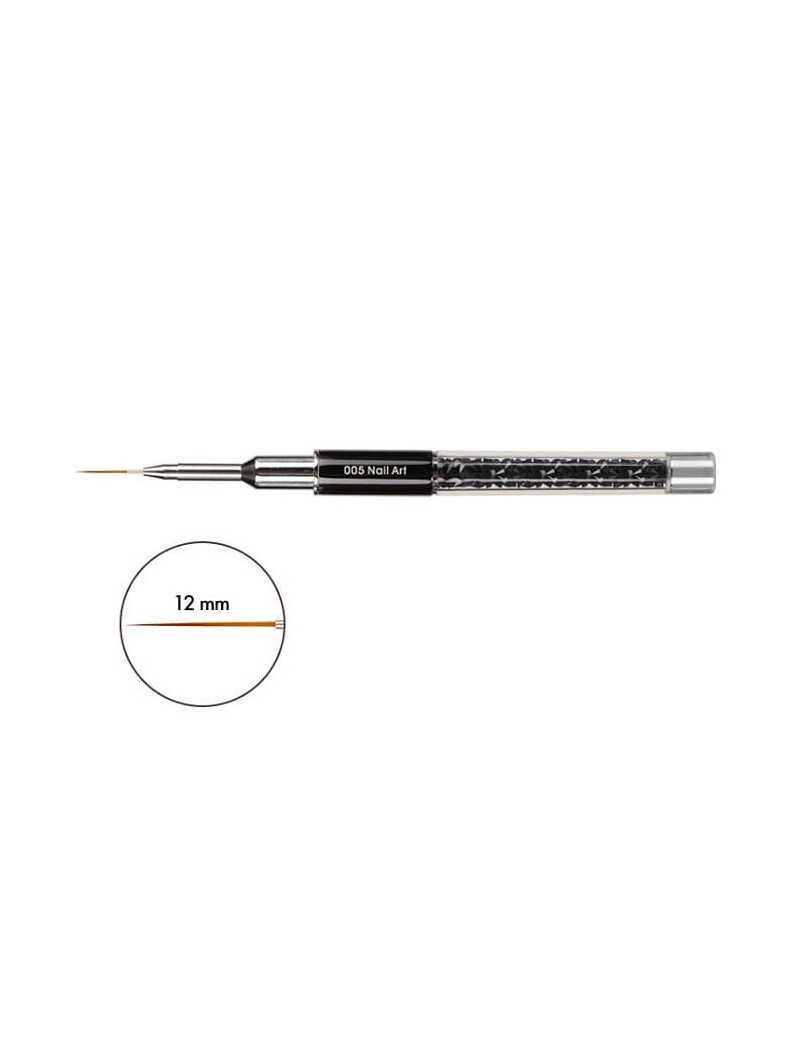Pędzel przeznaczony do malowania cienkich, długich, precyzyjnych linii, iluzji, geometrii, długość włosia 12 mm. Wysoka jakość nylonowego włosia gwarantuje stabilność i dokładność pracy, pędzel jest precyzyjny, idealnie wyprofilowany, wygodny w użytkowaniu. Posiada elastyczne i sprężyste włosie, które nie odkształca się, a także metalową skuwkę zabezpieczającą pędzel. Elegancki design z czarnymi kryształkami.