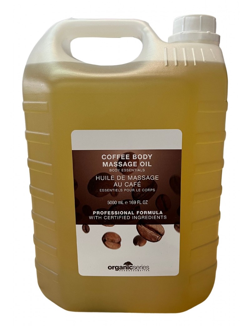 Olej do masażu Organic kawa 5L Bio olej do masażu twarzy i ciała stworzony w 100% z naturalnych składników, tłoczony na zimno z nasion sezamu, winogron i rzepaku. Dzięki obecności nienasyconych kwasów tłuszczowych i fosfolipidów pobudza aktywność enzymów, które odpowiadają za rozbijanie tkanki tłuszczowej. Optymalnie nawilża i wygładza skórę. Masaż z użyciem oleju stymuluje spalanie tkanki tłuszczowej, wydalanie toksyn, poprawia krążenie krwi i dotlenia komórki.