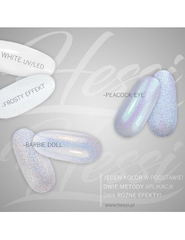 Pyłek Frosty Effect wystarczy wetrzeć w top, który pozostawia warstwę dyspersyjną lub posypujesz pyłkiem lepką, nieutwardzoną powierzchnie lakieru hybrydowego i dopiero utwardzasz całość w lampie . Nie pokrywasz TOPEM!.