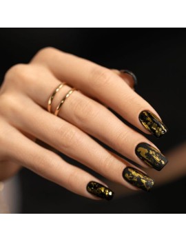 TRANSFER FOIL można odbijać miejscowo lub na całym paznokciu. Przyłożyć folię matową stroną do warstwy dyspersyjnej wykonanej stylizacji hybrydowej, żelowej lub żelowo-akrylowej. Stylizacje z wykorzystaniem każdego rodzaju folii należy utrwalić odpowiednim topem Victoria Vynn i dokładnie zabezpieczyć wolny brzeg paznokci. Utwardzić w lampie 60s.