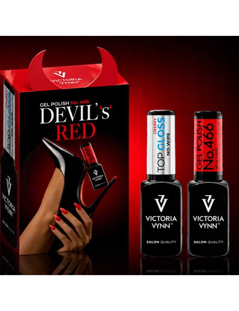 W duecie znajdziesz głęboki czerwony lakier hybrydowy Devil’s Red oraz top Oh! My Gloss, który zabezpiecza kolor i nadaje mu wyjątkowy połysk.