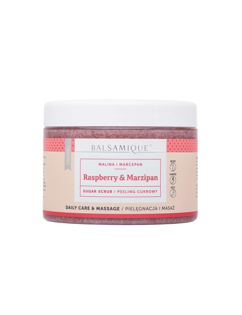 PEELING CUKROWY MALINA Z MARCEPANEM to peeling do ciała, który w swoim składzie zawiera kryształki cukru trzcinowego oraz zmielone pestki moreli, powodując dokładne wygładzenie i odświeżenie skóry. Dzięki swojej szczególnej recepturze przyczynia się do lepszego wchłaniania substancji odżywczych. Olej kokosowy i migdałowy działają wygładzająco i uelastyczniają, a masaż poprawia mikrokrążenie w skórze. Apetyczny i przyjemny zapach dodatkowo spowoduje uczucie odprężenia i relaksu.