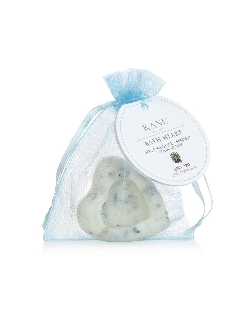 Serce musujące biała herbata z bławatkiem 50 g Ręcznie formowane serce do kąpieli o zapachu białej herbaty z bławatkiem to idealny pomysł na domowe SPA! Produkt zawiera masło shea oraz masło kakaowe, które zadbają o odpowiednie nawilżenie skóry podczas kąpieli.