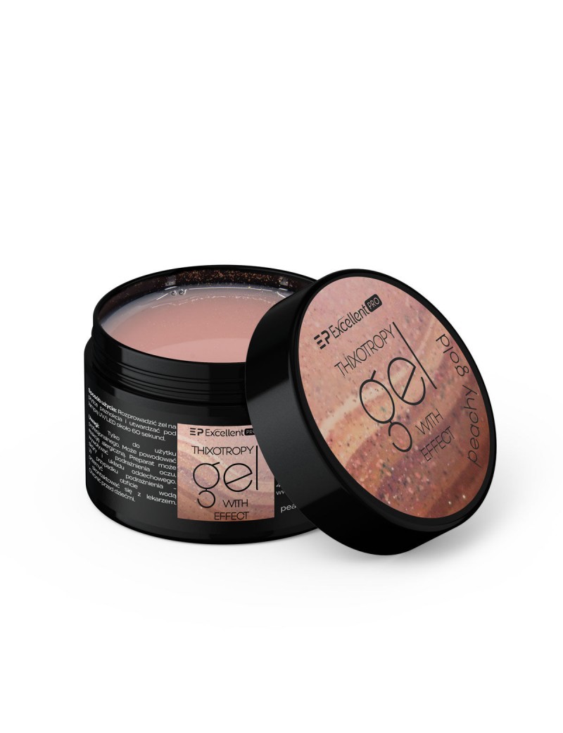 EXCELLENT PRO THIXOTROPY GEL WITH EFFECT PEACHY GOLD - to jednofazowy, budujący żel w brzoskwiniowo-beżowym kolorze z dodatkiem złotej drobinki. Przepiękny kolor roku 2024, podkreślony dodatkiem złotego brokatu, pozwoli na stworzenie bardzo szybkiej i efektownej stylizacji. Doskonale sprawdzi się jako baza pod różnorakie zdobienia. Dzięki specjalnie stworzonej formule produkt rozkłada się bardzo przyjemnie, a jego tiksotropowe właściwości sprawiają, że żel nie spływa na skórki, co zapewnia pełną kontrolę nad aplikowanym produktem i pozwala na wydłużony czas pracy nim. Ten samopoziomujący się żel doskonale nadaje się do każdego rodzaju przedłużeń na szablonie oraz tipsie, a także do utwardzania naturalnej płytki. Idealny do zacisku, nie odkształca się podczas polimeryzacji. Niezwykle trwały i odporny żel z przepięknym efektem zapewni szybką i łatwą pracę, bez obaw o pękanie i wykruszanie się produktu. Uwaga! Aby uzyskać jak najlepszą przyczepność żelu oraz ze względu na zawartość drobiny, przed nałożeniem zalecamy nałożyć przeźroczystą bazę. Rekomendujemy użycie Excellent PRO One Coat Multifunction Grafen Base.