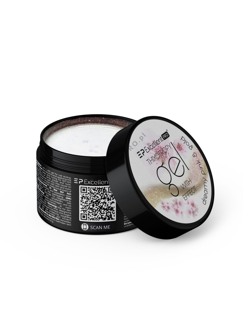 EXCELLENT PRO THIXOTROPY GEL WITH EFFECT DREAMY PINK&GOLD - to mlecznobiały żel z dodatkiem różowozłotej drobinki, który świetnie sprawdzi się jako produkt solo lub jako podkład pod wszelkiego typu zdobienia. Jednofazowy, samopoziomujący się żel, który idealnie nadaje się do utwardzania naturalnej płytki oraz do przedłużeń na szablonie i tipsie w dowolnych długościach. Ten przepięknie mieniący się żel posiada pamięć cieczy, co pozwala na wydłużony czas pracy na płytce, bez obawy o zalane skórki. Dzięki właściwościom tiksotropowym zyskujemy pełną kontrolę nad aplikowanym produktem oraz zmienną konsystencję. W pojemniku sprawia wrażenie gęstego, ale po nałożeniu na płytkę staje się trochę rzadszy, dzięki czemu łatwiej nim manewrować. Żel o takich właściwościach doskonale sprawdzi się w metodzie "bez piłowania", co pozwala na oszczędność czasu i produktu. Podczas zachodzącego procesu fotopolimeryzacji, potocznie zwanym "utwardzaniem", nie odkształca się. Niezwykle wytrzymały, twardy i odporny na uszkodzenia mechaniczne produkt pozwoli cieszyć się trwałą stylizacją przez cały okres jej noszenia. Odpowiedni dla stylistek na każdym etapie rozwoju warsztatu. Uwaga! Aby uzyskać jak najlepszą przyczepność żelu oraz ze względu na zawartość drobiny, przed nałożeniem zalecamy nałożyć przeźroczystą bazę. Rekomendujemy użycie Excellent PRO One Coat Multifunction Grafen Base.