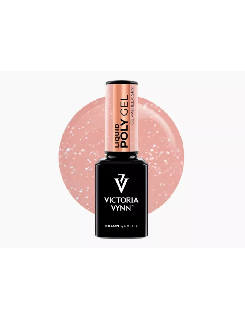 LIQUID POLY GEL 06 Vanilla Sky to płynny akrylożel w kolorze różu ze złotymi drobinkami. Łączy on wytrzymałość akrylu z lekkością żelu, a samopoziomująca płynna formuła w butelce idealnie sprawdzi się do szybkiej nadbudowy, przedłużenia paznokci i metody bez piłowania "One Drop".