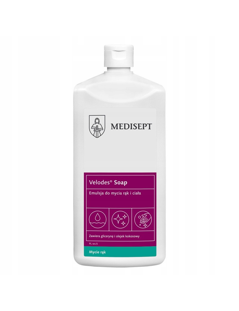 Zastosowanie: Velodes® Soap to emulsja do mycia rąk przed chirurgiczną i po higienicznej dezynfekcji rąk. Nadaje się do mycia skóry głowy i całego ciała. Ze względu na zawartość składników pielęgnujących takich jak gliceryna i olejek kokosowy, zalecana jest szczególnie dla personelu medycznego narażonego w wyniku częstego mycia na macerację skóry. Emulsja polecana także do mycia pacjentów w profilaktyce odleżyn. Przebadana dermatologicznie.