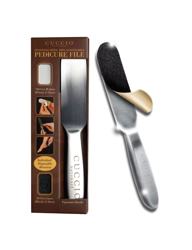W zestawie: pilnik do stóp, nakładka 80 grit (czarna) x 15szt, nakładka 180 grit (biała) x 15szt. Pilnik do pedicure wykonany w 100% z uszlachetnionej stali nierdzewnej. Jednorazowe nakładki ścierne, o dwóch grubościach ziarna, nakleja się na rękojeść - czarna (80 grit) z łatwością usunie duże zrogowacenia, biała (180 grit) idealnie wygładzi. Wodoodporny papier fuji zapewnia optymalną ścieralność.